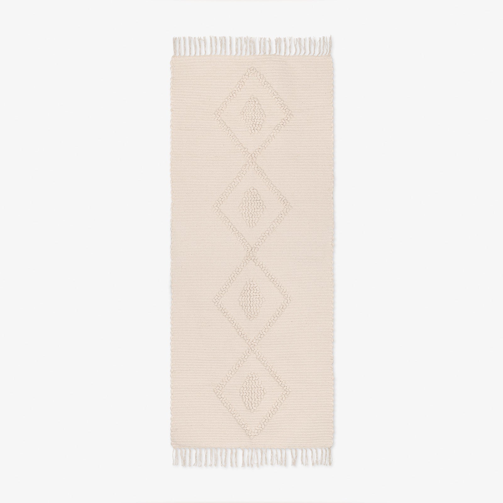 Our Bohemian rug is handmade in India. Woven in 100% unbleached natural cotton.