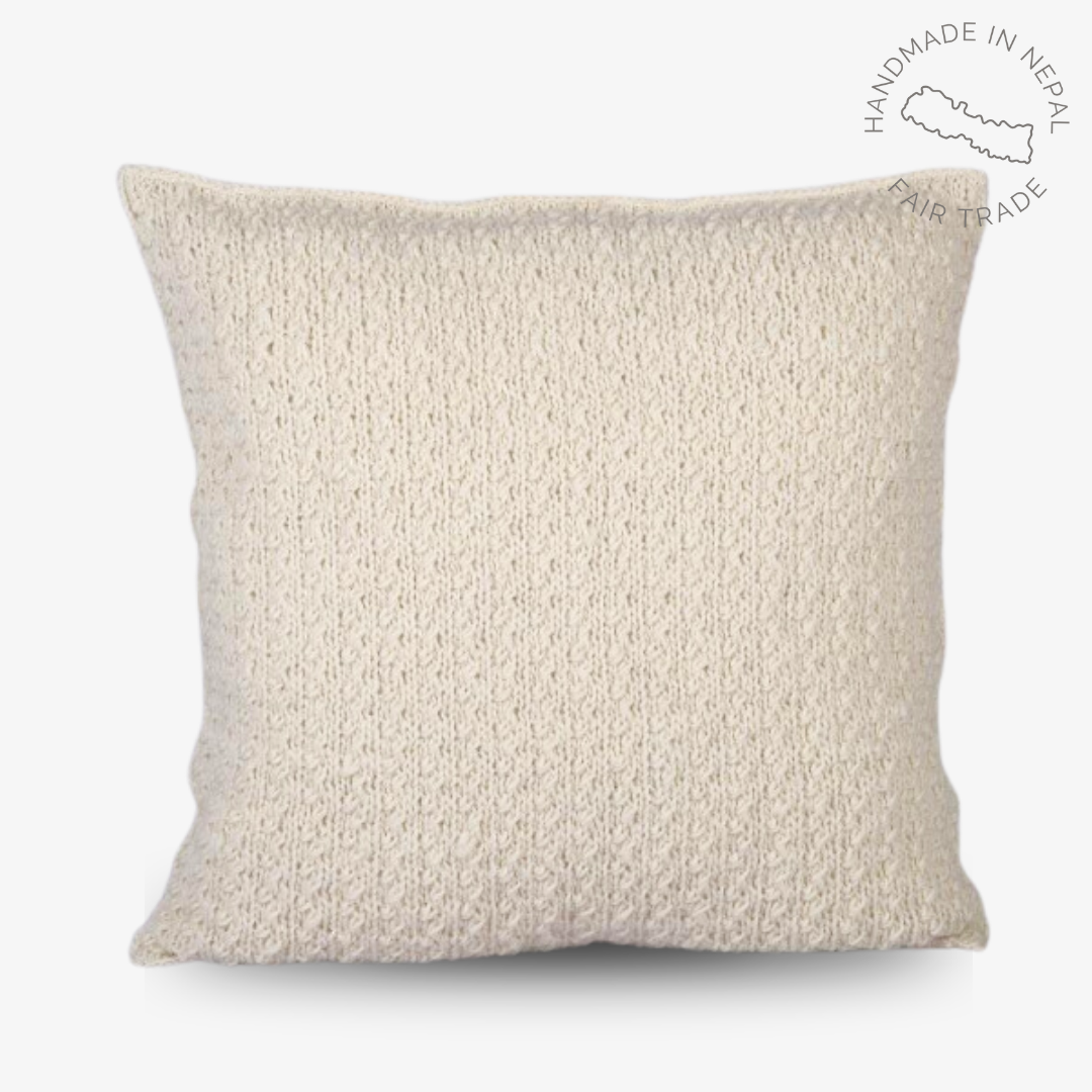 Håndstrikket Fair Trade uldpude med bomuldsbagside og træknapper. Monteringspude er fremstillet i Danmark med naturligt fjerfyld.